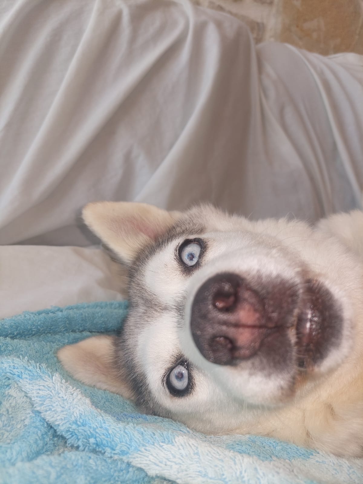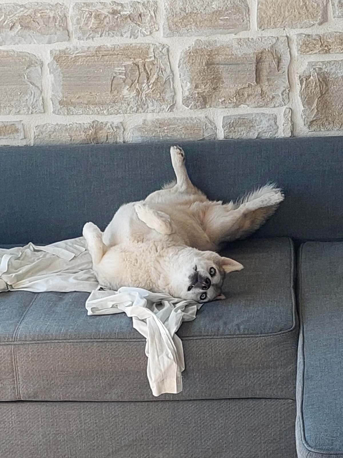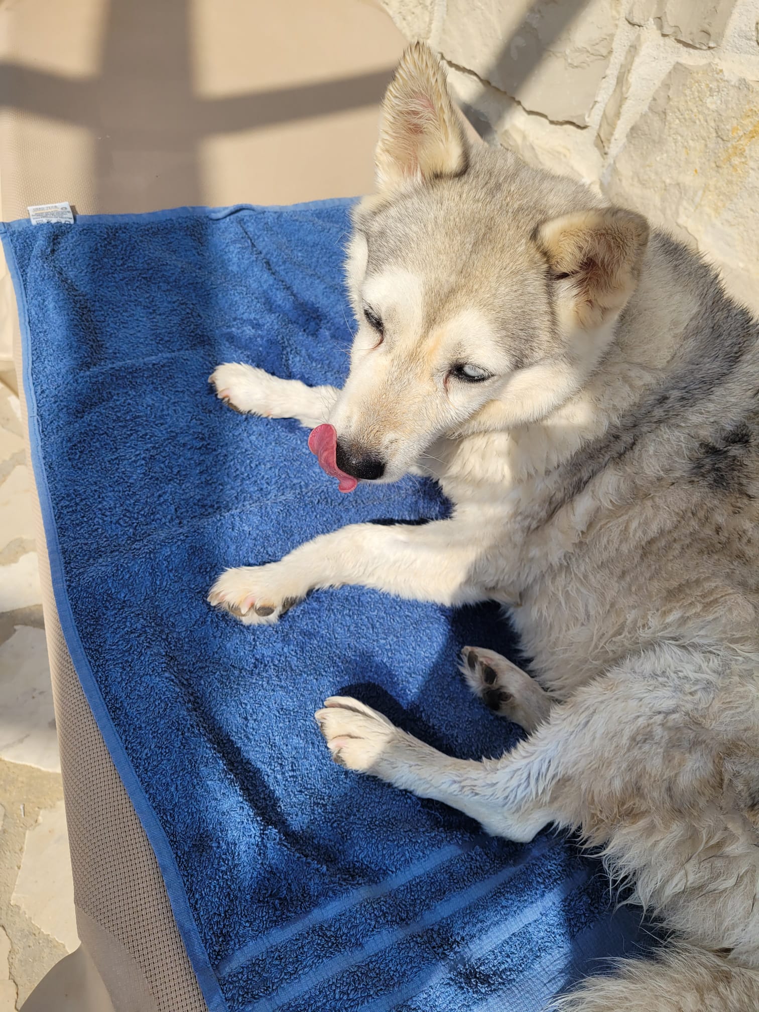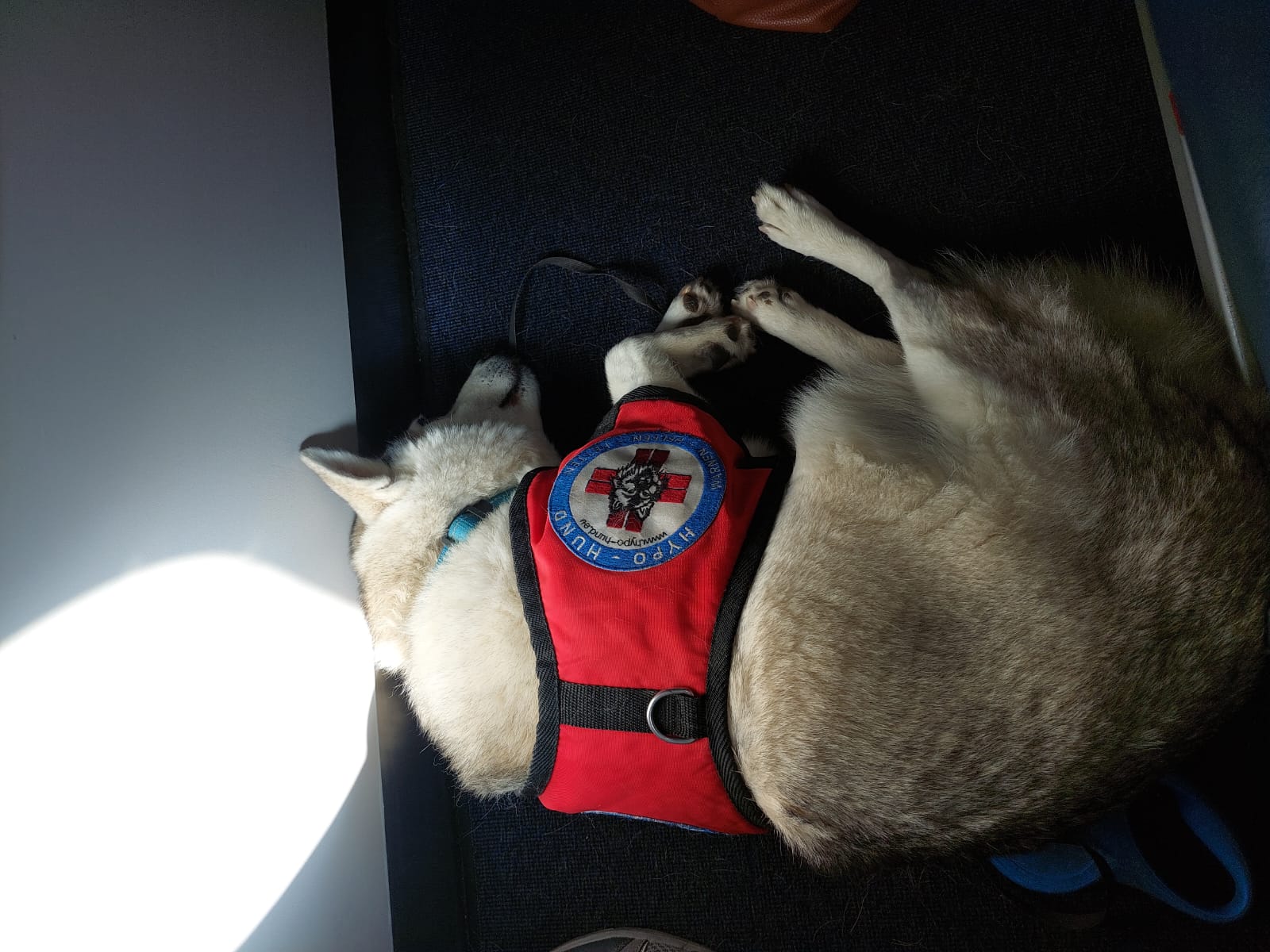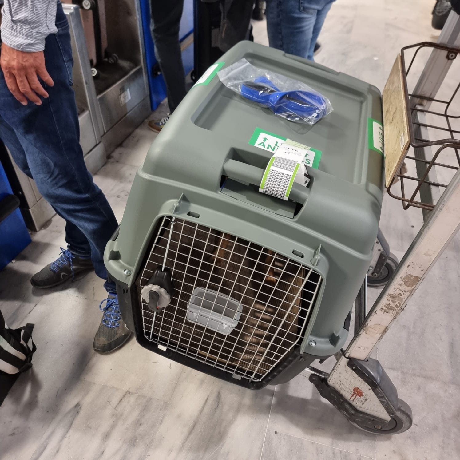 Luna auch beim Rückflug entspannt, zudem haben wir im Frachtraum noch einen ehemaligen Straßenhund aus einem Tierheim für eine Familie in Kiel mitgenommen – alles lief gut.