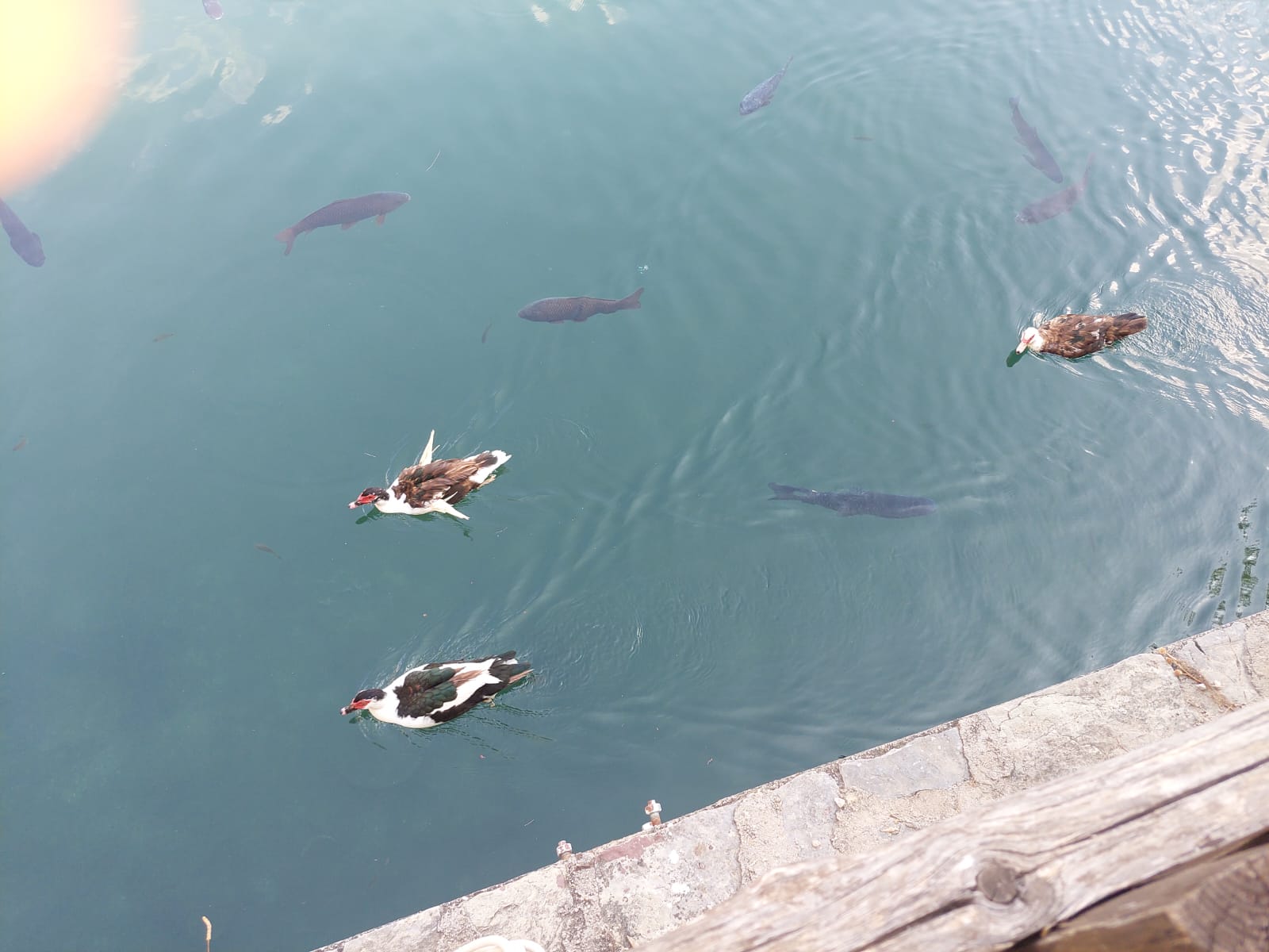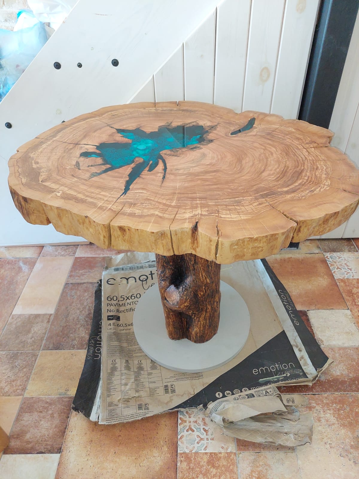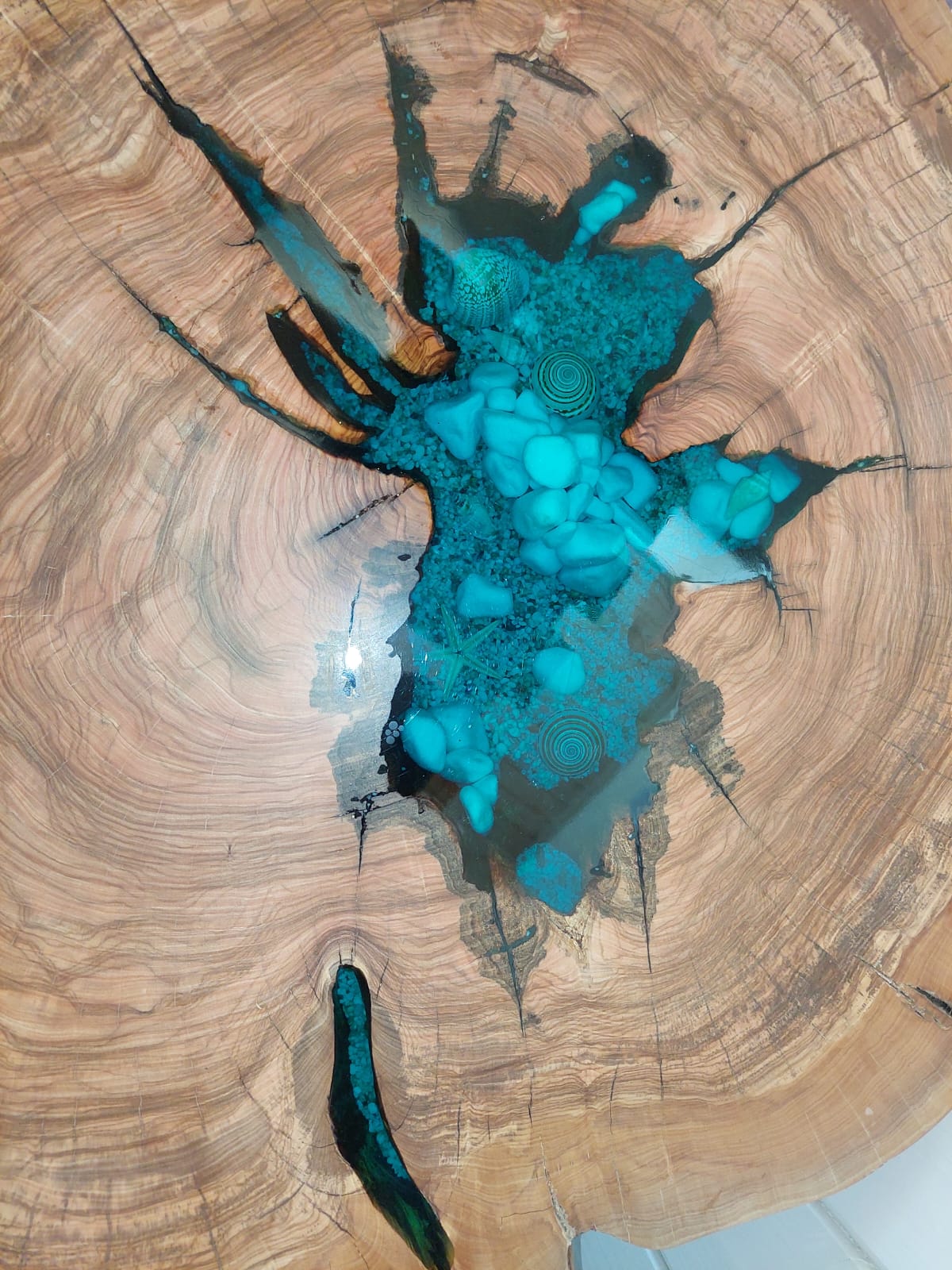 Tisch aus Olivenholz mit türkisem Epoxydharz (diese Farbe!!) gekauft fürs neue Haus. Plastikflaschen gefüllt mit Wasser in die Bäume gehängt, die künftig mehr Schatten spenden sollen (ich lerne so viel!). Tür vom Plateau wurde vom Tischler nach Sturmschaden repariert und danach gestrichen – immer was los…