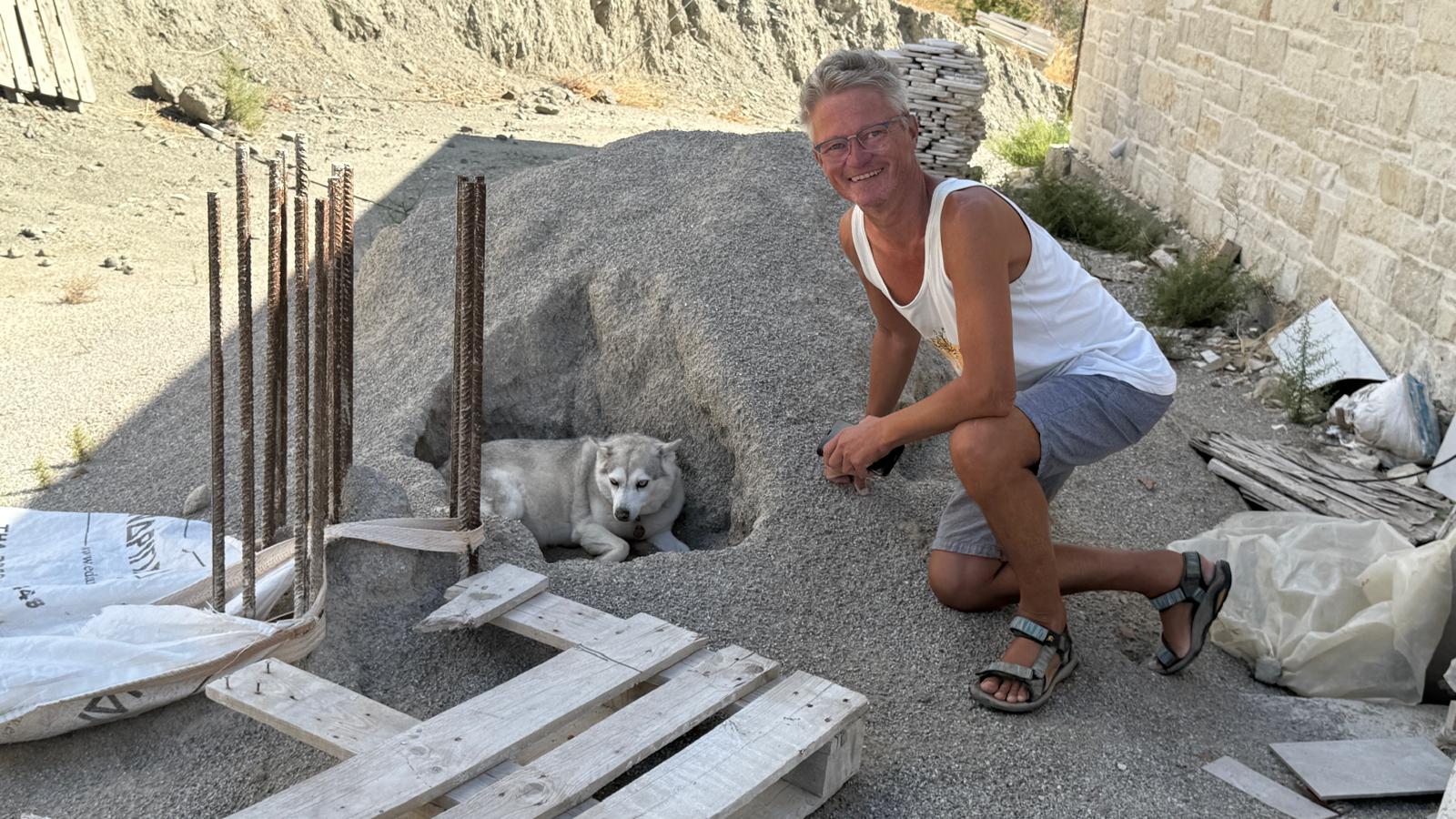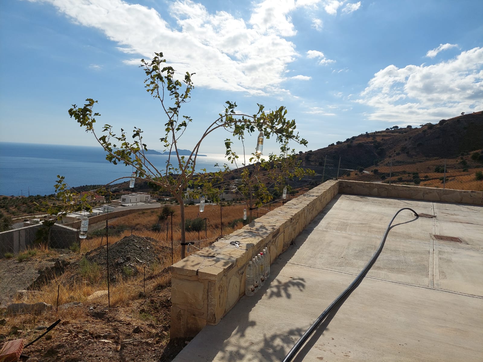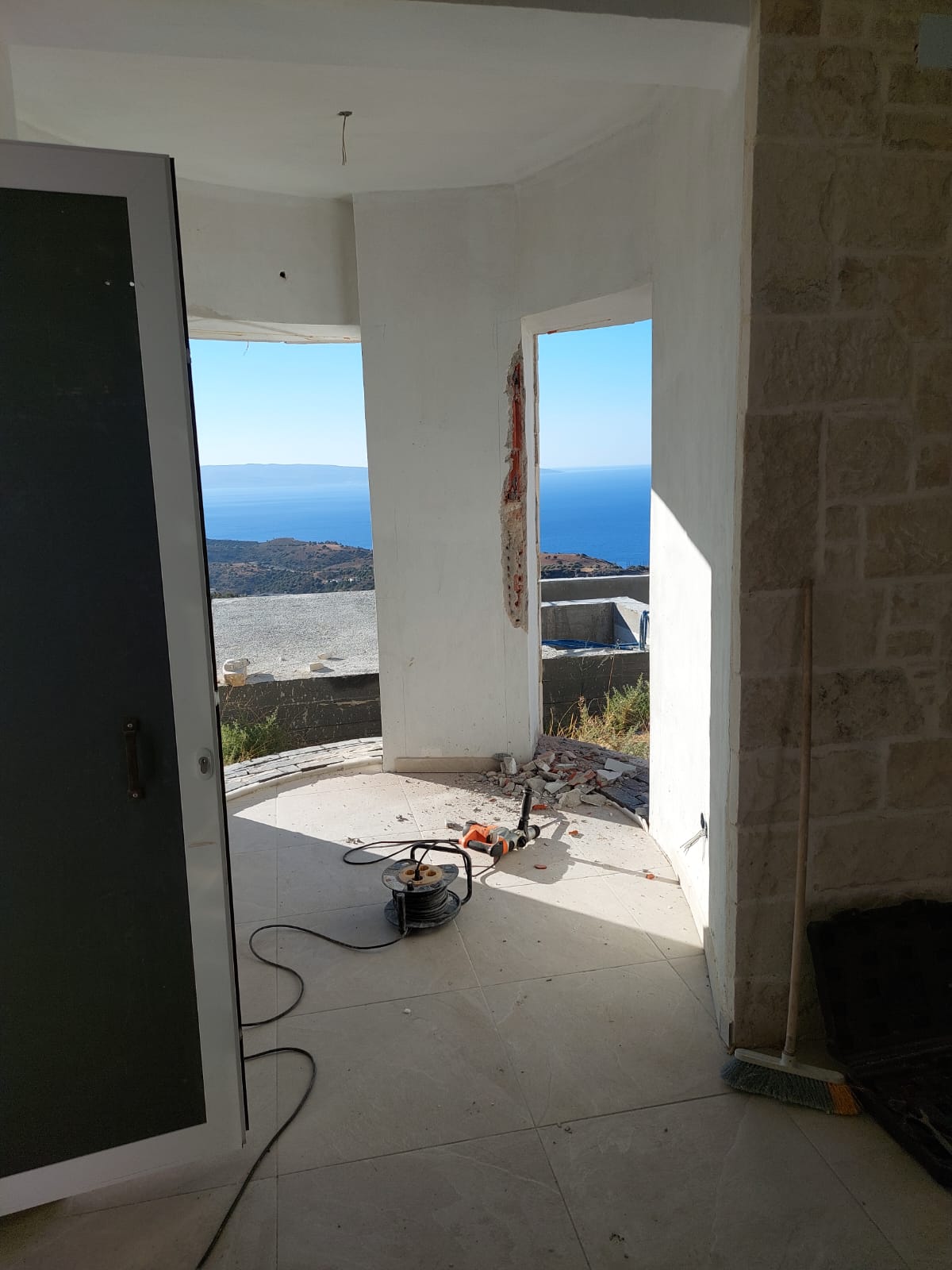 Das Haus wird erdbebensicher gebaut, top isoliert und wird ganzjährig nutzbar sein. Der unverbaubare Blick Richtung Ort und Meer ist jeden Tag ein Traum. Ein Tischler aus dem Ort hilft prima, jetzt stehen die Beton-Außenarbeiten an Nord-Zufahrt, Terrasse, Pool und Technikraum an.