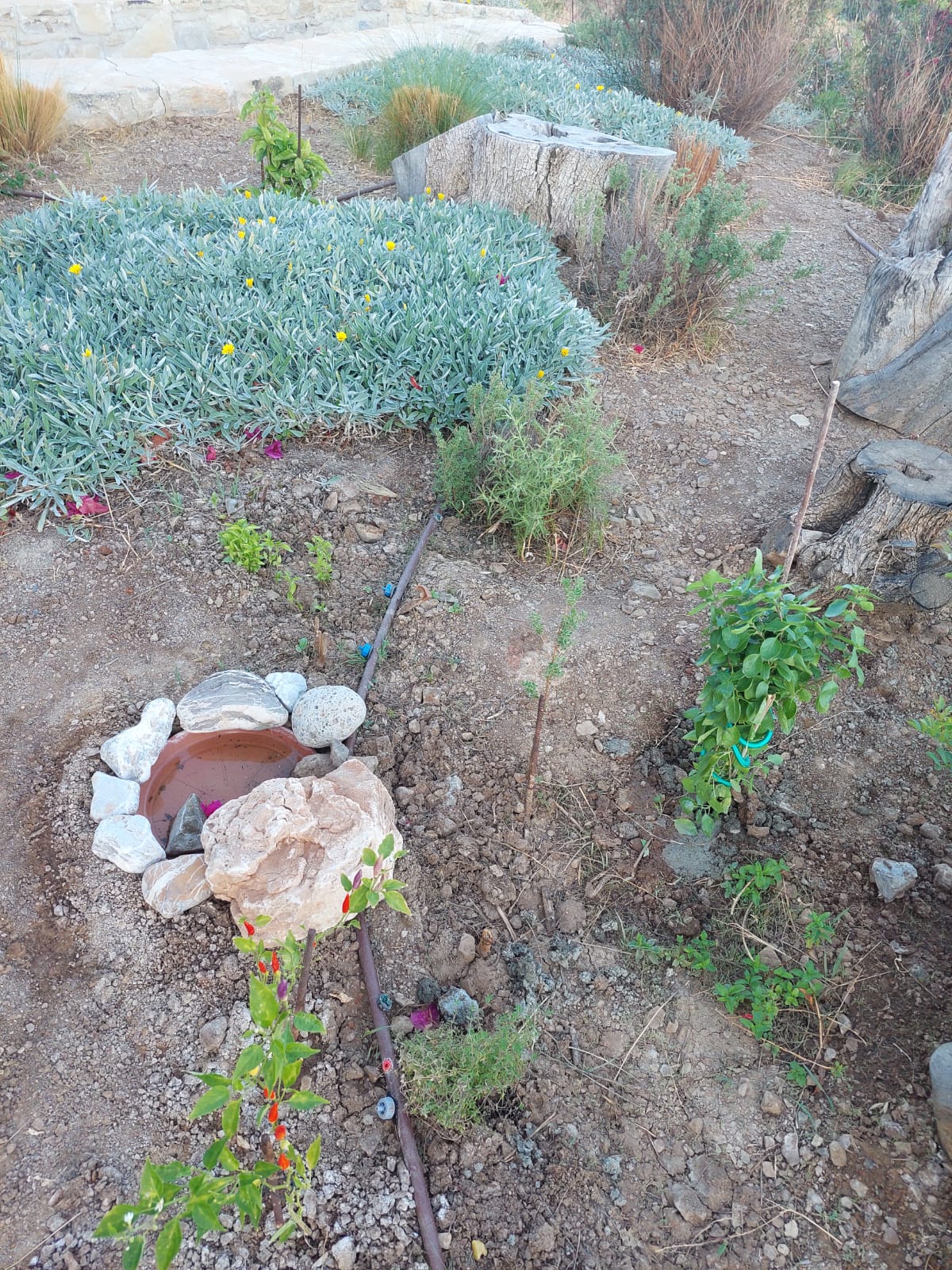 Die Wasseraufbereitungsanlage, mit der alles Schmutzwasser für die Gartenbewässerung genutzt werden kann, bekommt 60cm Einstiegsluken. Der Schlafraum im Plateau bekommt eine hochwertige Klimaanlage, damit es nun ganzjährig genutzt werden kann. Vogeltränke gebaut, die an der täglichen Bewässerung hält (wird auch von Schmetterlingen, Libellen und Insekten genutzt), Glaser ab und zu mal da. Weitere gute Freunde zu Besuch. Putzarbeiten innen von großartigem Handwerker bewältigt. Ich organisiere einen Kran, damit die Steinmarmorplatten vor dem Winter vom Dach kommen.