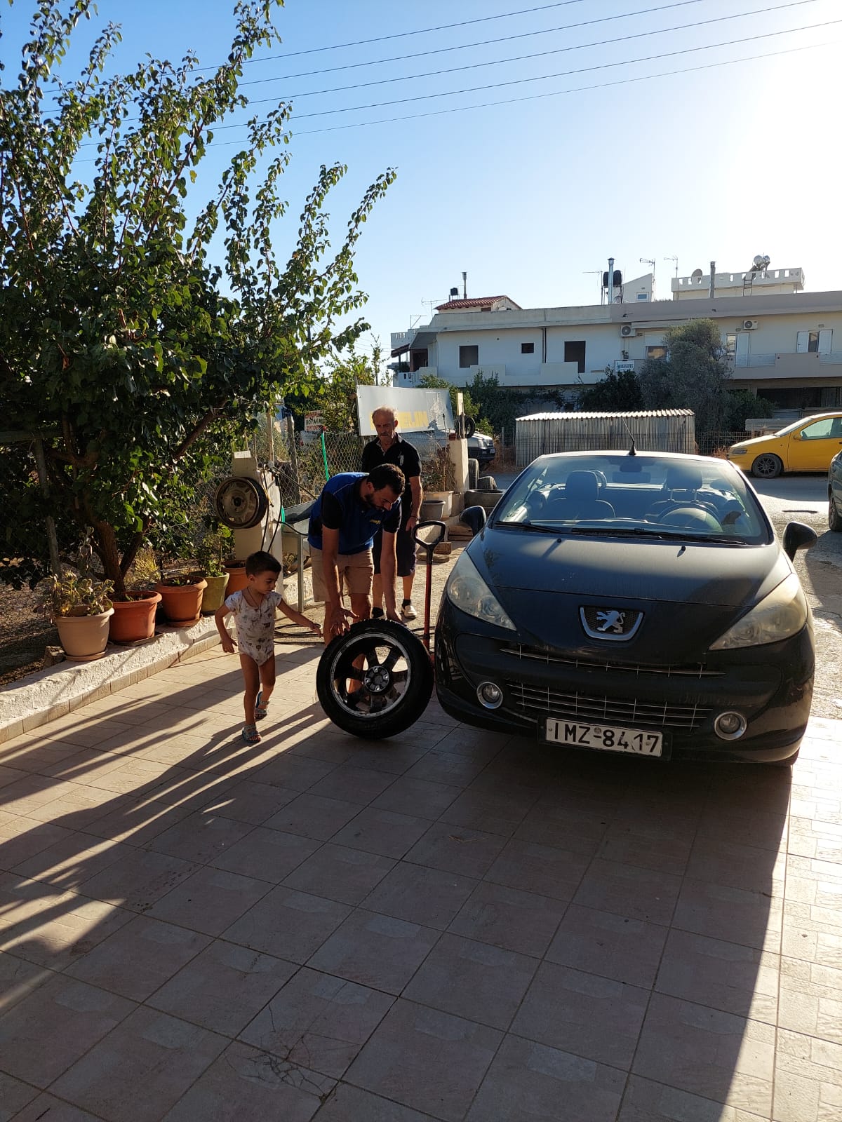 KTEO (also TÜV), immer wieder ein Erlebnis. Kurz vorher noch ein defekter Reifen in Timpaki; sofort stürmen 3 alte freundliche Griechen aus dem Kafenion und zeigen mir wer helfen kann: 300 m weiter sitzen Großvater, Vater und Sohn auf deren Auffahrt, diagnostizieren bei Raki, dass der Reifen kaputt ist, bringen einen gebrauchten passenden Reifen eines anderen Herstellers. Auf meine deutsche Frage, dass die Größe passe, aber dieser sei von einem anderen Hersteller, wird gelacht, mir ein Raki angeboten – das Auto geht ohne Mangel durch den TÜV, obwohl der Bordcomputer einige Meldungen hat (zum Glück auf Deutsch).