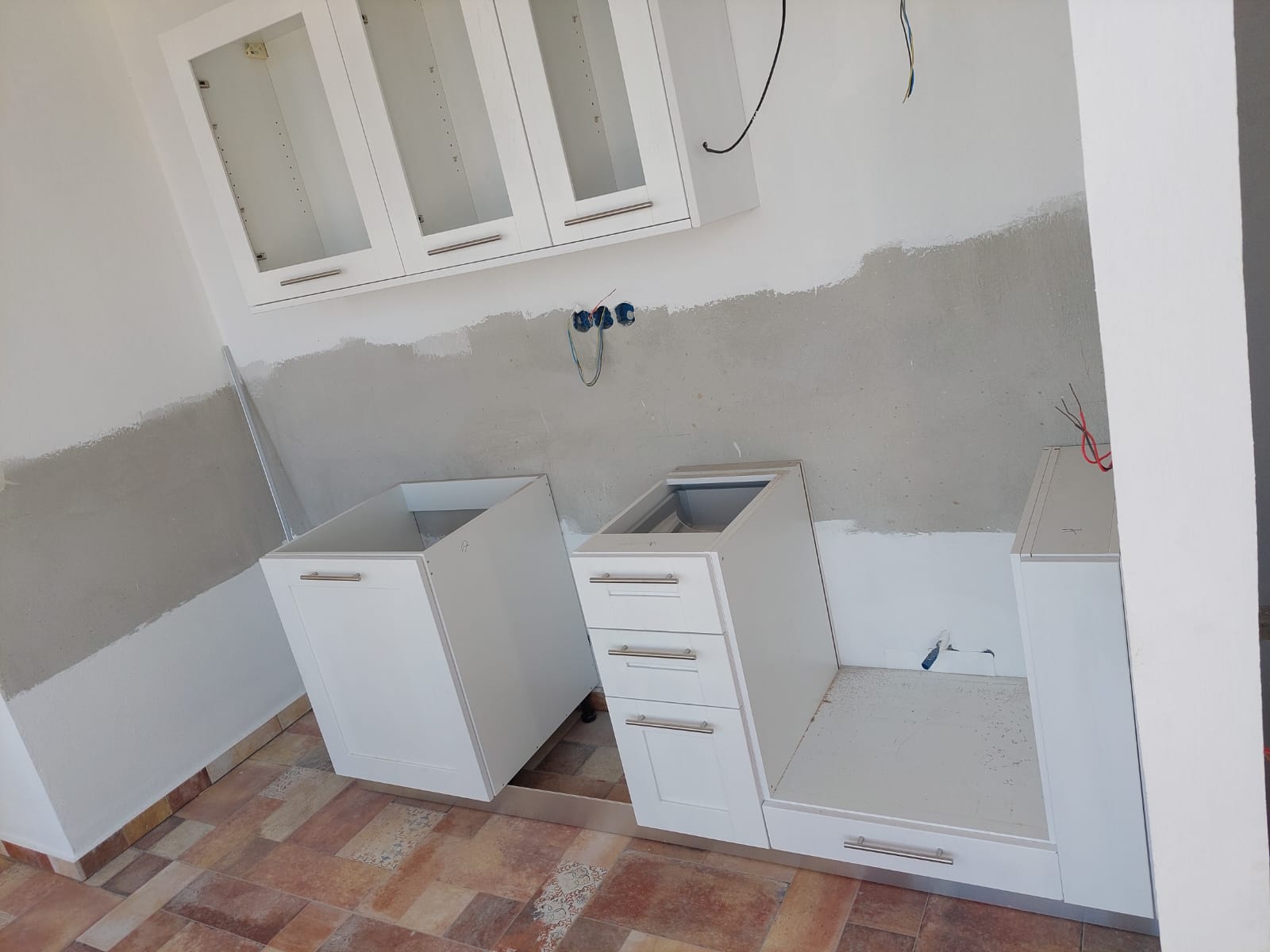 Der Februar 2020 steht ganz im Zeichen des Innenausbaus. Innenwände mauern bzw. verputzen, Fußboden isolieren, Fußbodenheizung installieren auf dem neuen Estrich, dann Fliesen. Küche und Treppe werden weiß, Möbel weiß und grau, so dass es gut auf den im nahegelegenen Timpaki gefundenen Fliesen passen wird.