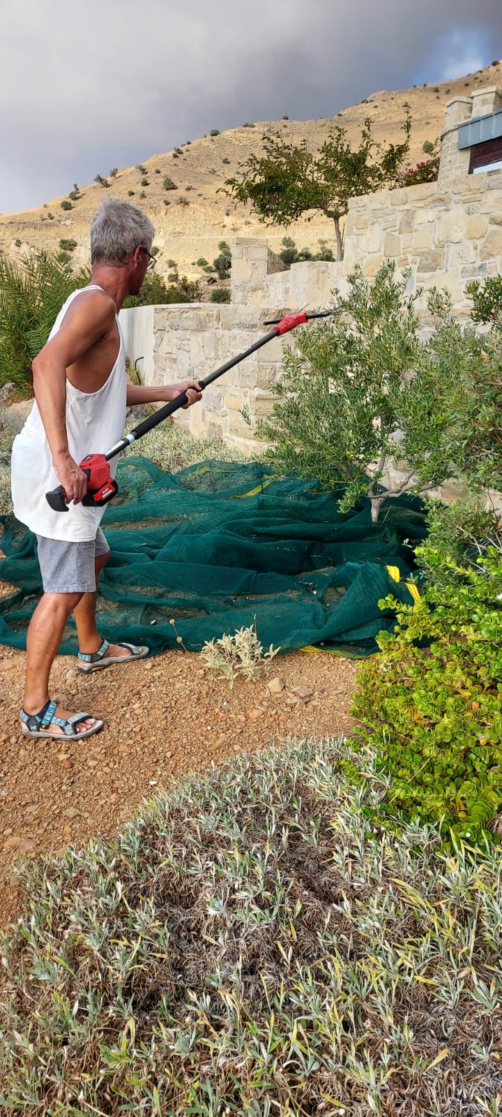 Erste Olivenernte mit 9,65kg eigener Ernte. Zusammen mit befreundeten Nachbar entsprechendes Gerät und Netze, Säcke gekauft – wir haben viel Spaß und etwas Muskelkater.